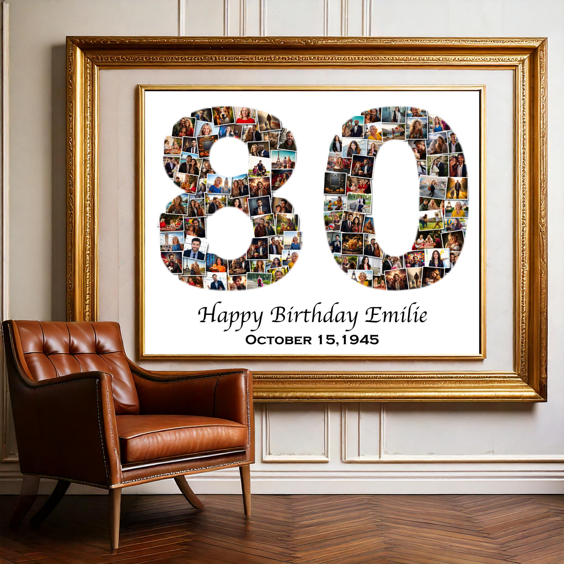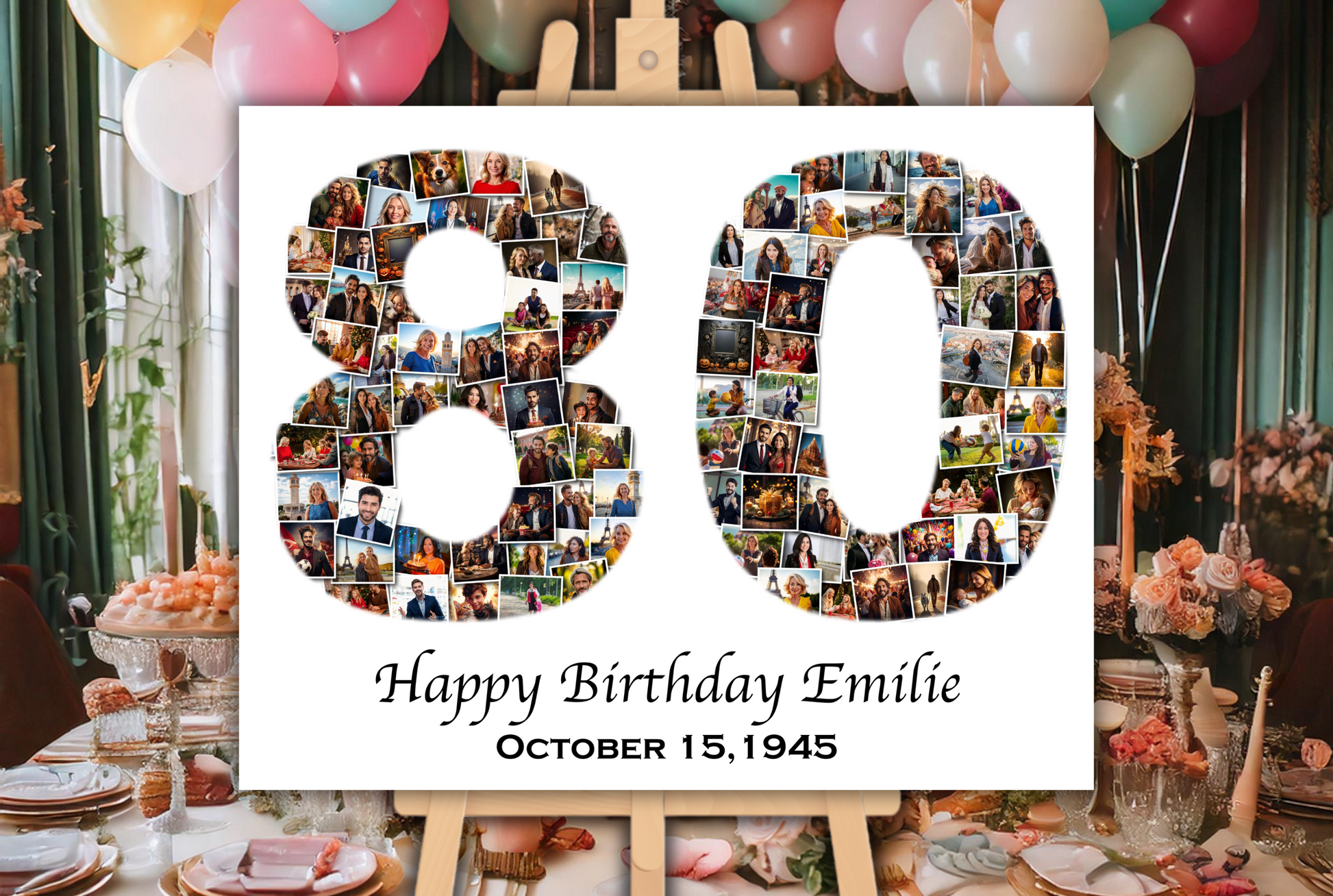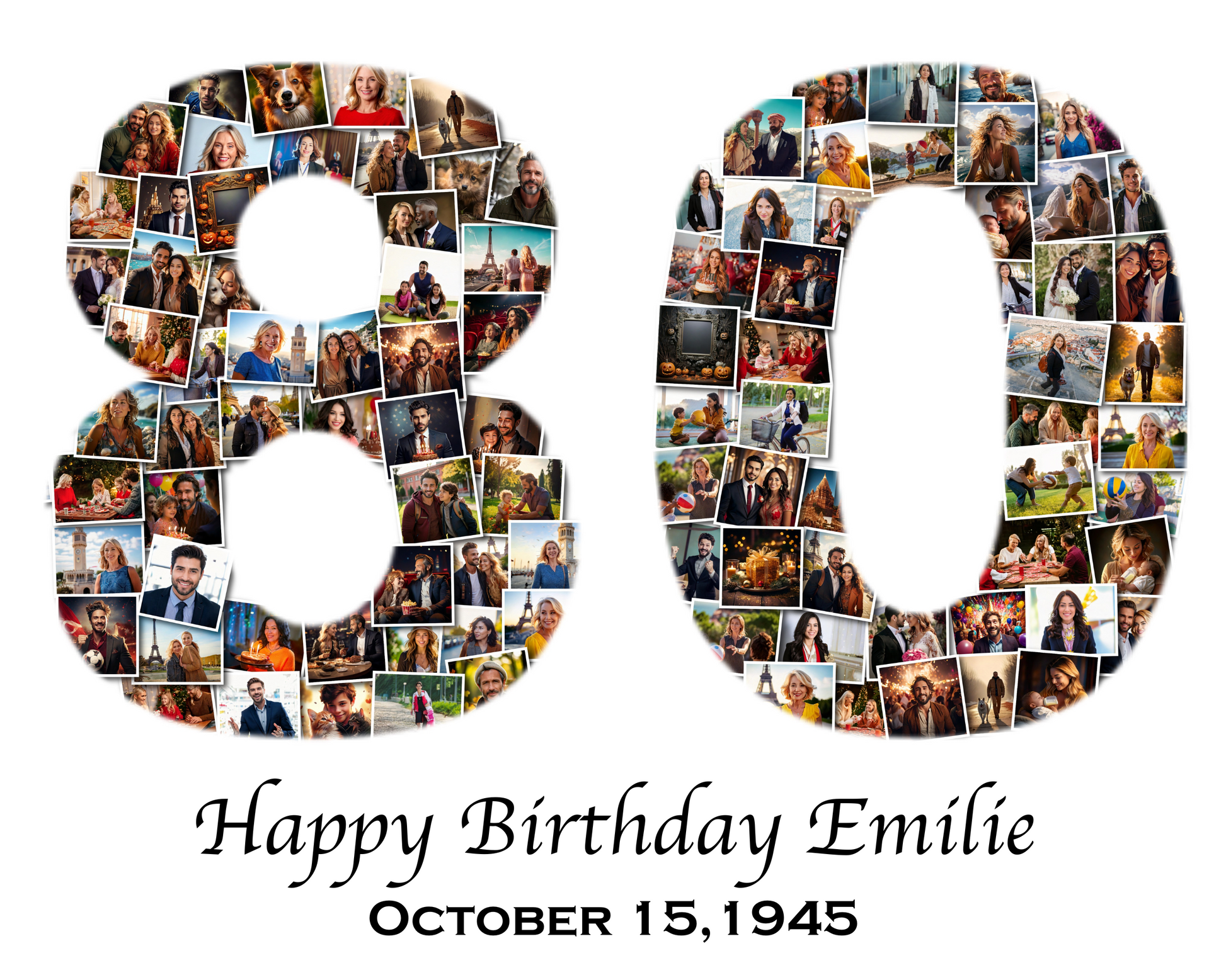 Suchen Sie nach einem wirklich unvergesslichen Geschenk zum 80. Geburtstag ? Unsere individuelle Zahlen-Fotocollage zum 80. Geburtstag vereint Ihre schönsten Erinnerungen zu einem einzigartigen und bedeutungsvollen Kunstwerk.