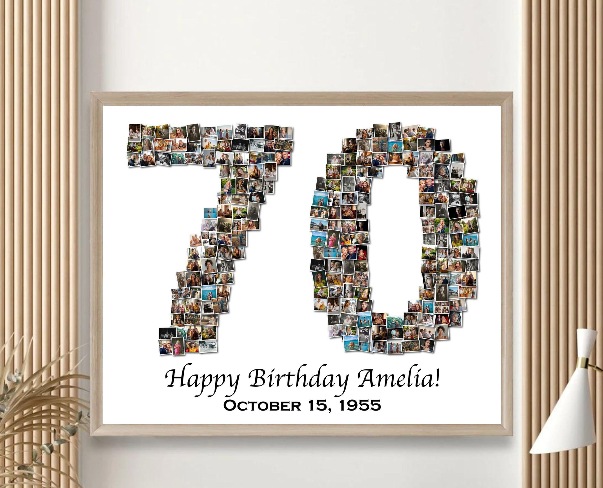 Looking for a truly memorable 70th birthday gift? Our Custom 70th Birthday Number Photo Collage brings together your most cherished memories into a unique and meaningful artwork.