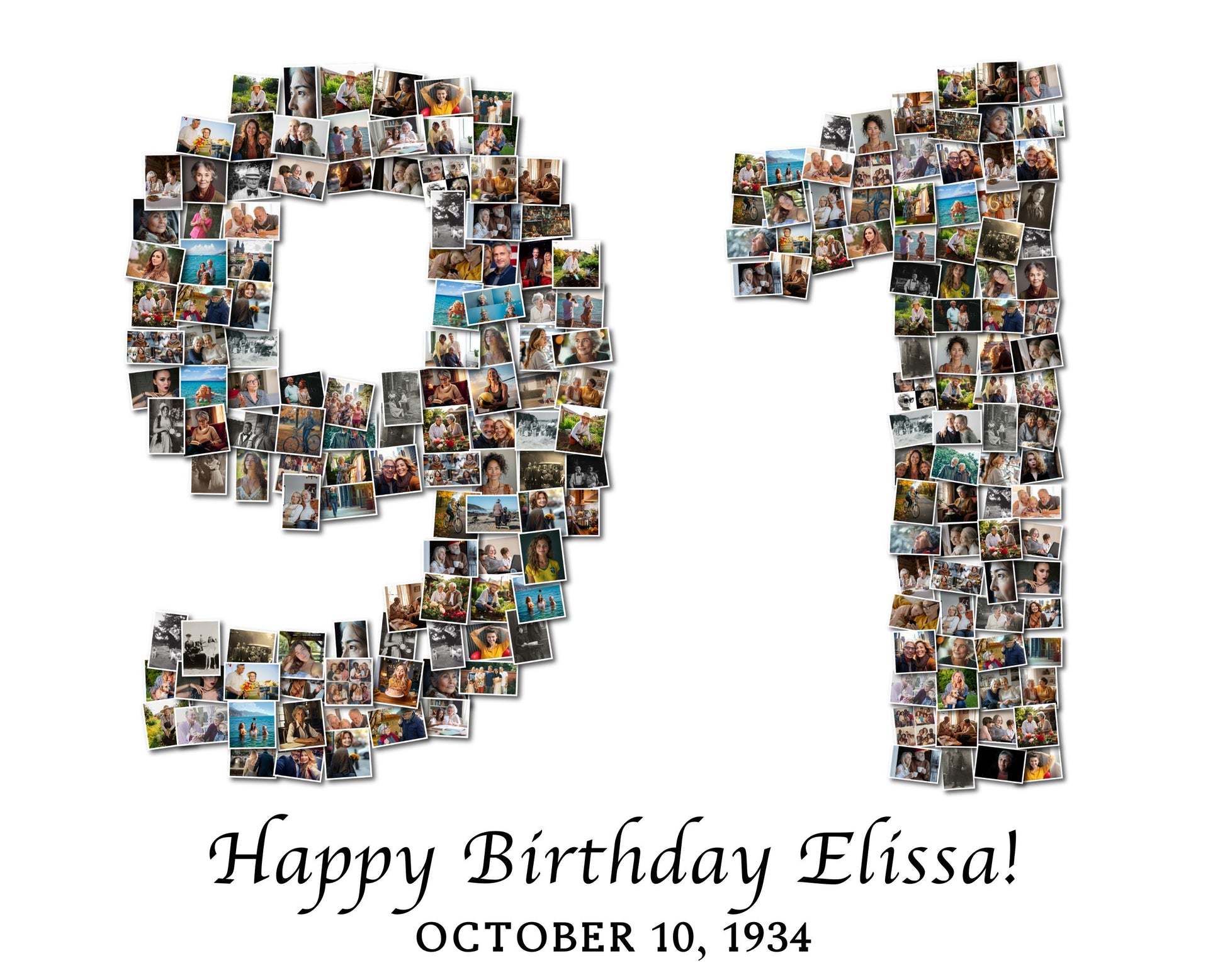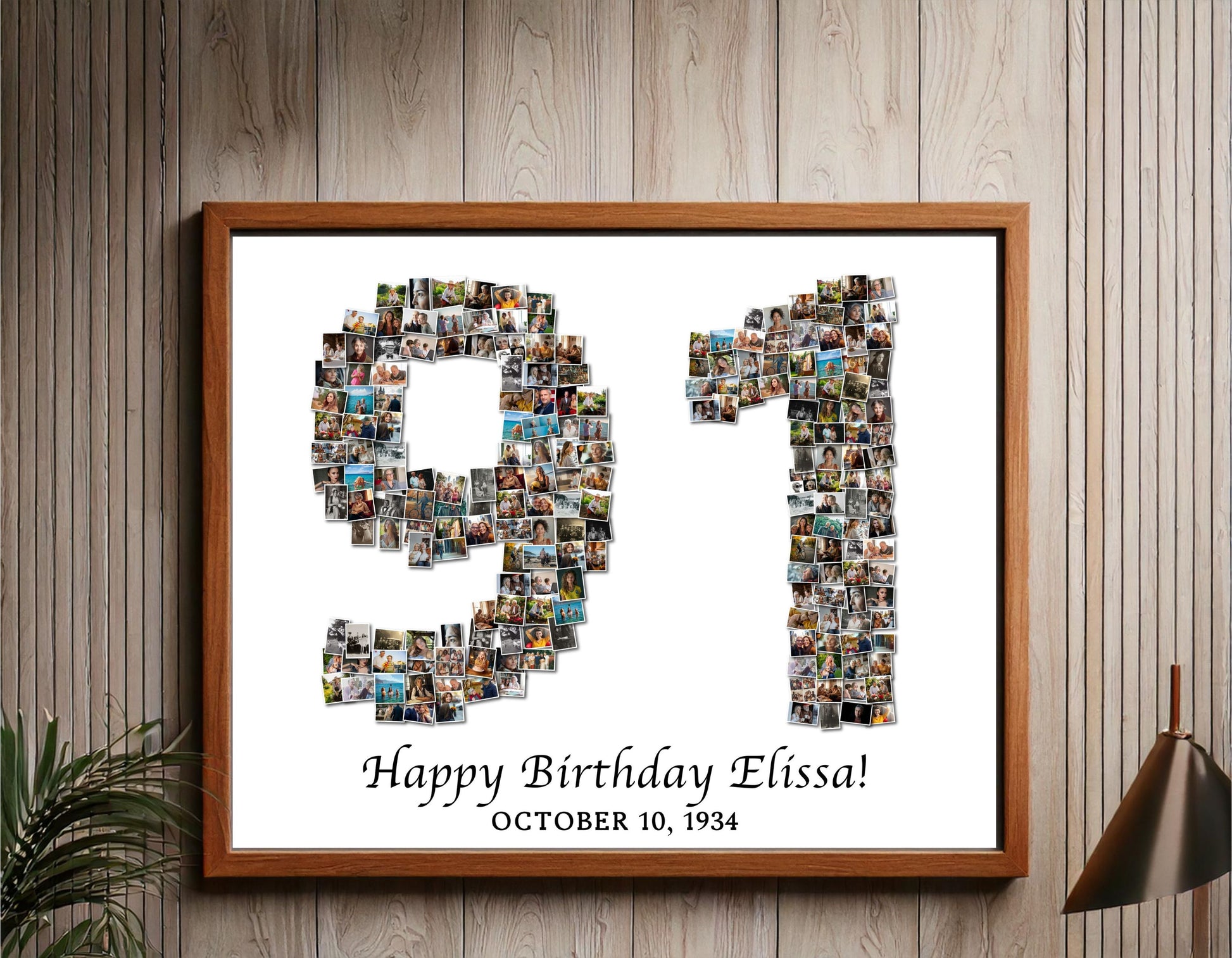 Looking for a truly memorable 91st birthday gift? Our Custom 91st Birthday Number Photo Collage brings together your most cherished memories into a unique and meaningful artwork.