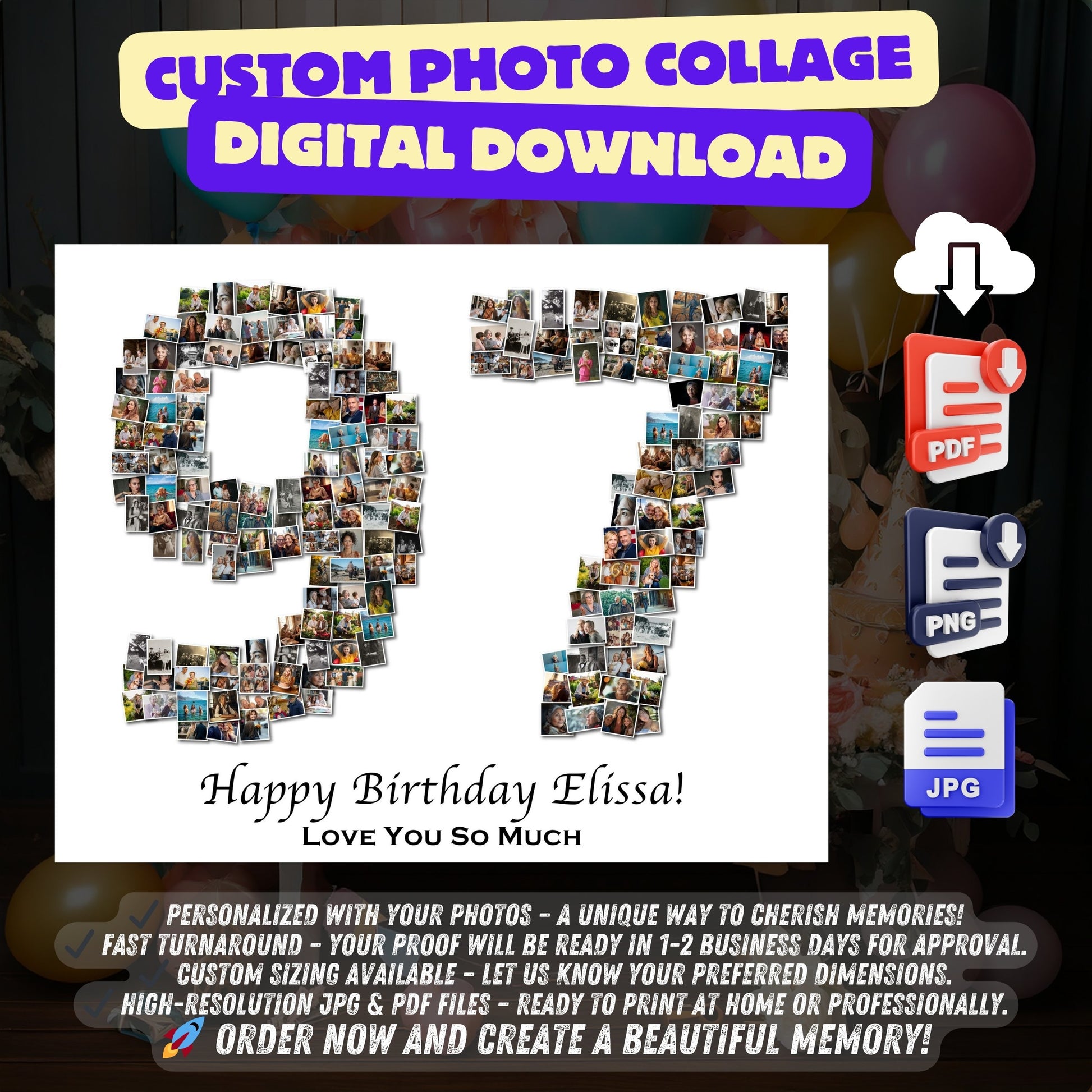Looking for a truly memorable 97th birthday gift? Our Custom 97th Birthday Number Photo Collage brings together your most cherished memories into a unique and meaningful artwork.